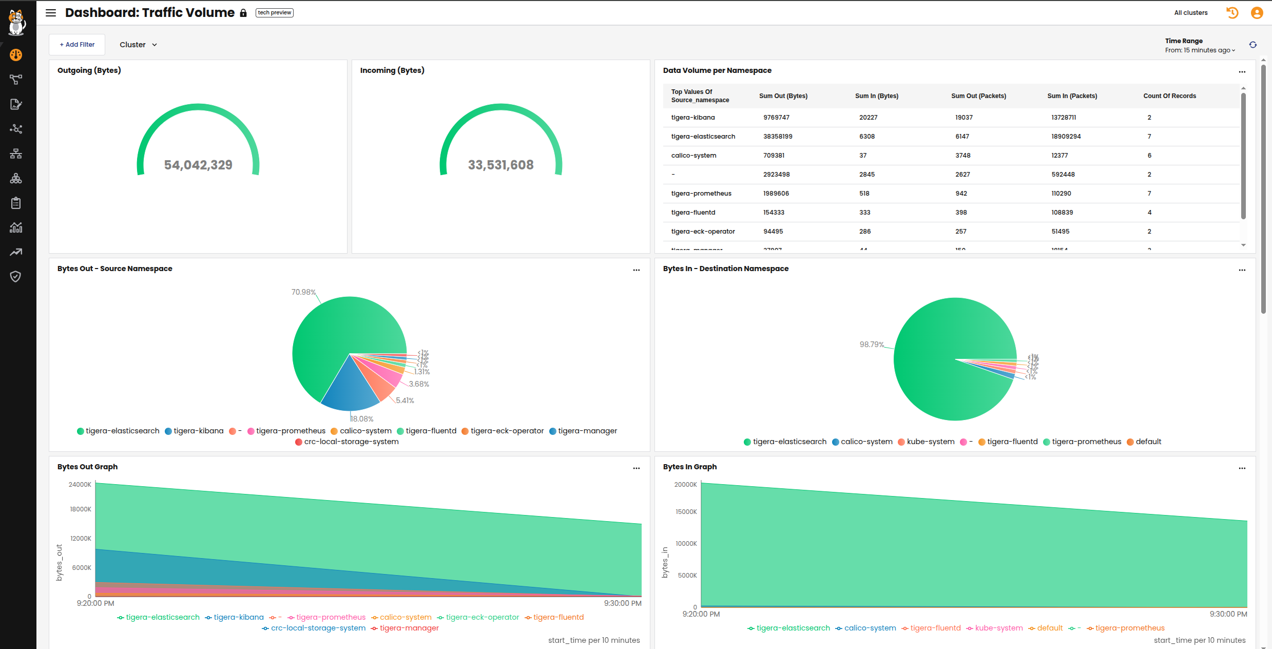 The Traffic Volume dashboard provides a high-level view of traffic in your cluster.